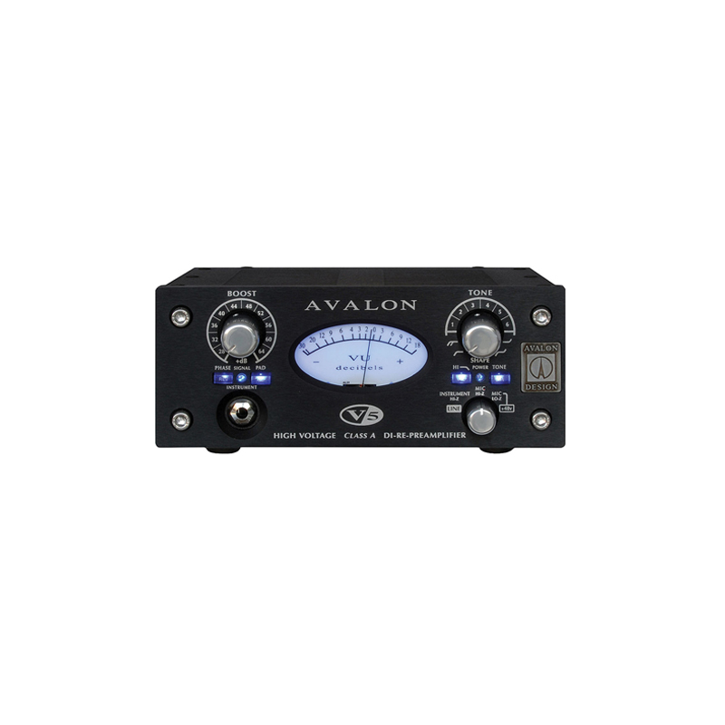 The Avalon V5 DI-RE-MIC Preamplifer is an ultra-high performance professional preamplifier, DI and RE-amper. Created for maximum versatility, the V5’s sonic signature – “Deep and Controlled Bass, Musical Mid-range and enhanced Vocal Projection” combine with a unique set of user features including, 100% discrete Pure Class A amplification, Avalon’s unique “passive” TONE-BANK™, professional VU meter with dual peak LED’s, multiple outputs including an instrument level transformer isolated Re-amp. Designed to optimize absolute signal integrity and musical performance, the V5 is ideal for ribbon, dynamic and condenser microphones, bass guitar, acoustic instruments, electric guitars, keyboards, synthesizers, and very low output passive pickups