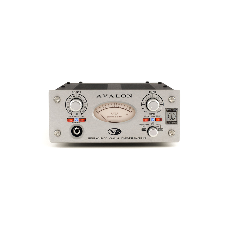 The Avalon V5 DI-RE-MIC Preamplifer is an ultra-high performance professional preamplifier, DI and RE-amper. Created for maximum versatility, the V5’s sonic signature – “Deep and Controlled Bass, Musical Mid-range and enhanced Vocal Projection” combine with a unique set of user features including, 100% discrete Pure Class A amplification, Avalon’s unique “passive” TONE-BANK™, professional VU meter with dual peak LED’s, multiple outputs including an instrument level transformer isolated Re-amp. Designed to optimize absolute signal integrity and musical performance, the V5 is ideal for ribbon, dynamic and condenser microphones, bass guitar, acoustic instruments, electric guitars, keyboards, synthesizers, and very low output passive pickups