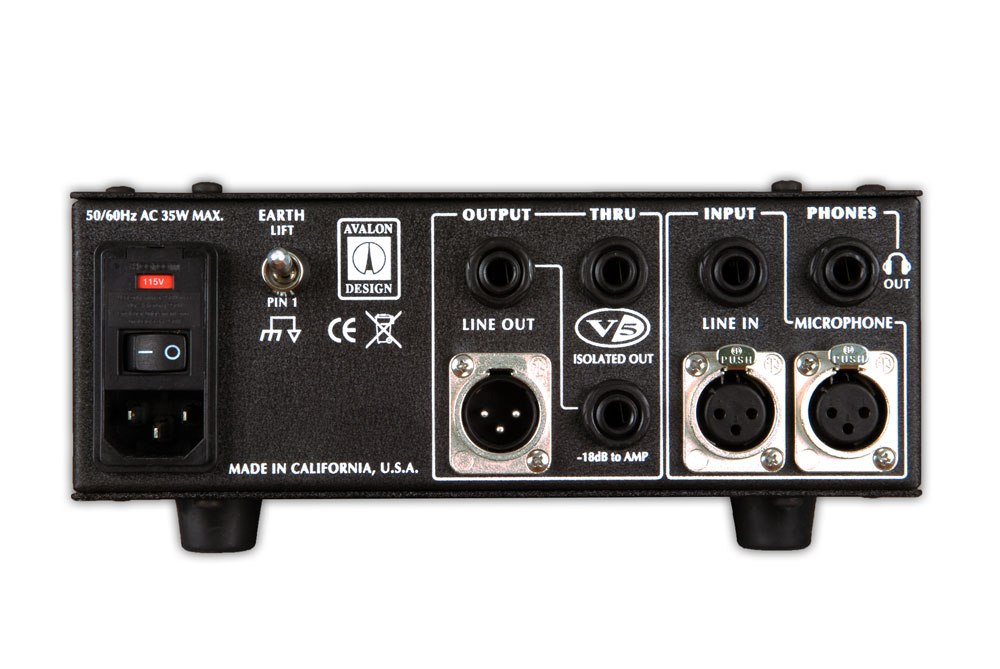 The V5 includes a very high quality input transformer (same as the Avalon VT-737sp) with dual microphone input impedance loading for perfect mic/cable matching, high-cut switch for eliminating unwanted acoustic pickup and high frequency noise, headphone monitor amp and DC coupled, 100% Class A output amplifiers for defined bass control. A buffered “thru” output for zero-instrument-load tuners or power amp inputs, internal toroid power transformer with discrete high-voltage power supplies for low noise and sealed silver relays for transparent signal routing.