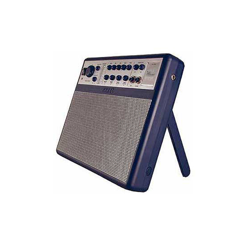 10 Watts RMS • Two 4 Inch Speakers • 18 Digital Effects • 3 Band EQ • 13 x 11 x 2 inches • 5lbs • Includes DC Transformer • Includes Car Adapter • Includes Carrying Case