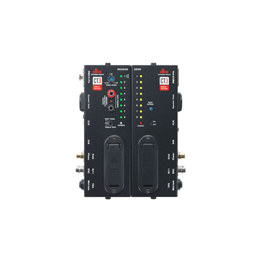 The dbx CT3 is an advanced cable testing unit allowing you to evaluate a large variety of cables with ease. The CT3 offers many common connectors such as RJ45, RJ11, MIDI, Speaker Twist, XLR, RCA Phono, BNC, DIN, TRS, TS, DMX, & Banana. It can be split into 2 parts, a SENDER and RECEIVER so preinstalled and long cables can be tested.