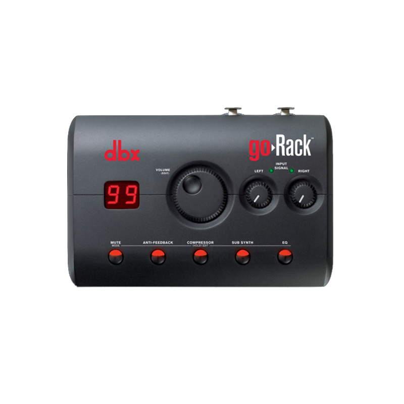 Historically, the convenience of portability in a PA System has meant a compromise in sound quality and fidelity. To answer that call, dbx is proud to introduce the all-new goRack™ Portable Performance Processor. The goRack is an easy-to-use portable speaker processor. Based on our industry-leading DriveRack® Series, the goRack sits next to a set of powered speakers and provides powerful signal processing including Anti-Feedback (based on our AFS™ Advanced Feedback Suppression algorithm), Compression, Sub-Harmonic Synth and EQ. Each processing function is easily enabled or disabled via the dedicated function buttons, and settings are adjusted via goRack’s large data wheel.