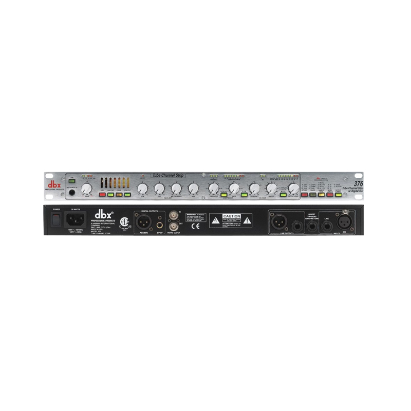 The 376 Tube Channel Strip w/Digital Output is the latest addition to the Silver Series family. The 376 puts the best of both worlds into one affordable package by combining the warmth of the vacuum tube, with the proprietary dbx Type IV® conversion system. The 376 boasts many of the same features as other products in the Silver Series, such as 48V phantom power, a phase invert switch, and low cut filtering. In addition, the 376 also offers digital output capabilities in both AES/EBU, and S/PDIF formats as standard features. The high impedance, 1/4″ instrument input located on the front panel, as well as the mic/line switch, and 20 dB pad show our dedication to providing convenience in the studio. The LED meters provide a clear and concise visual of the signal processing at a glance. The rear panel includes both mic and line inputs and outputs, word clock sync input and output, insertion jack and digital outputs. Add selectable sampling rates of 44.1 kHz, 48 kHz, 88.2 kHz, or 96 kHz; selectable dithering and noise shaping; and separate analog and digital output controls to this already impressive list of features, and we think you’ll agree that the 376 lives up to the uncompromising standards of dbx Professional Products.