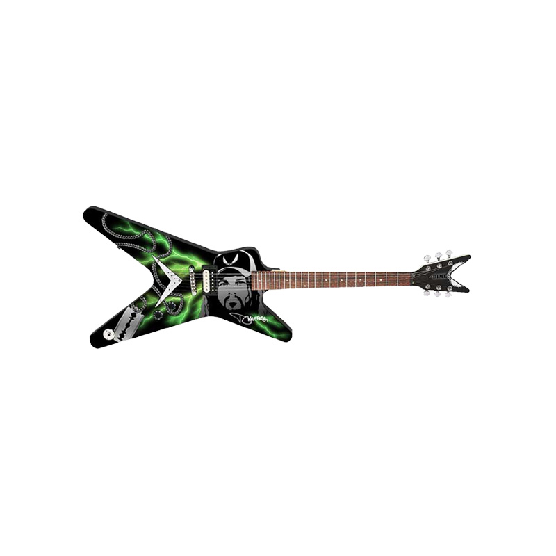 The graphics on the Dean Dimeblade Tribute electric guitar are amazing: a Dimebag Darrell portrait, his trademark lightning and razorblade dogtag graphics, and a print of Dime’s signature. It’s all there and the layout is the perfect compliment to the Dimeblade body shape. Once you’ve taken in the view, plug it in – this is a Dean, after all! Featuring the famous Dean headstock, string-thru body “V” tailpiece and bridge position humbucker. The lightweight basswood body and comfortable Dean neck will keep you playing your best through the whole gig.