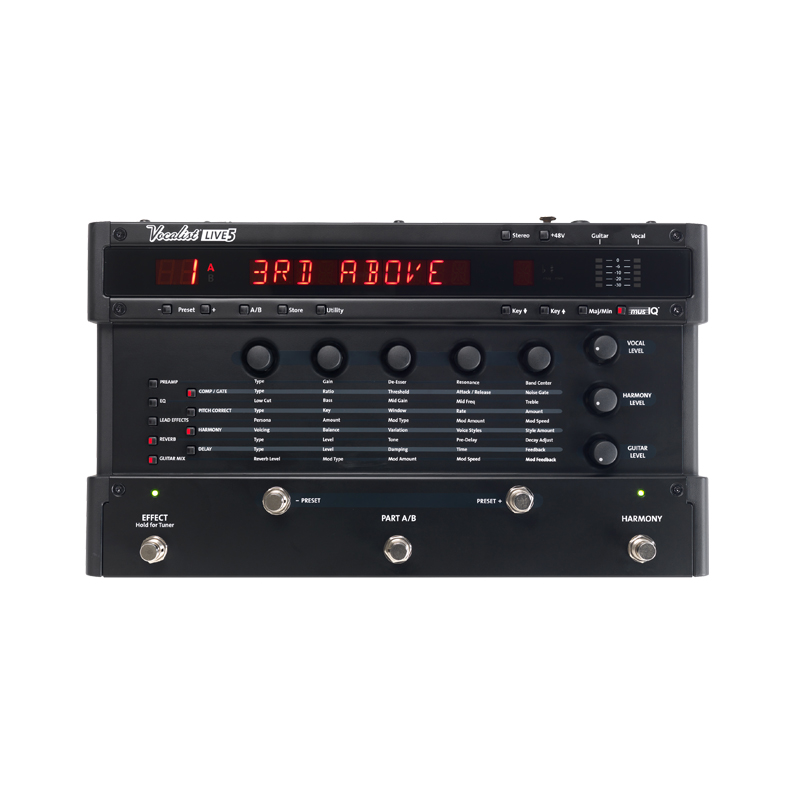 musIQ is a revolutionary technology that eliminates the need program a song’s key or changes to create accurate harmonies. musIQ analyzes your lead vocals as well as the chords and notes played on a guitar in real-time to automatically generate perfect vocal harmonies. Simply plug into the Live 5, play your guitar and sing. The musIQ technology will ensure the harmonies are always right on.