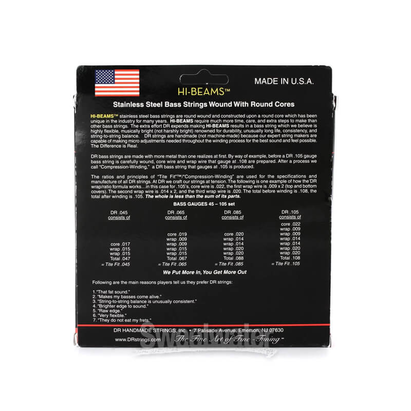 Stainless Steel Bass Strings wound on Round CoresHi-Beam stainless steel bass strings are round wound and constructed on a round core which is unique in the industry. Hi-Beams require much more time, care and extra steps to make than other bass strings. The extra effort DR expends making Hi-Beams results in a bass string that is highly flexible and musically but not harshly bright. They are renowned for durability, unusually long life, consistency and string-to-string balance. They don’t eat your frets.