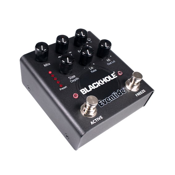 Limitless and boundless, Blackhole features two types of infinite reverb. “Infinite mode” continuously layers new sound on top of a suspended reverb while “Freeze mode” holds the effect in stasis, allowing you to play over the reverb tail. The Freeze Footswitch allows instant access to this feature.
