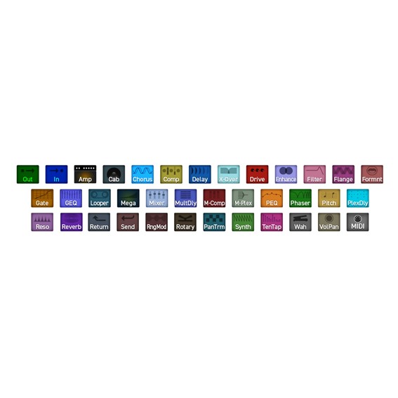 One of each of the available block types of the FM9 is shown below. Note that almost all of these can be used multiple times in every preset. A complete count can be found in our Blocks Guide.