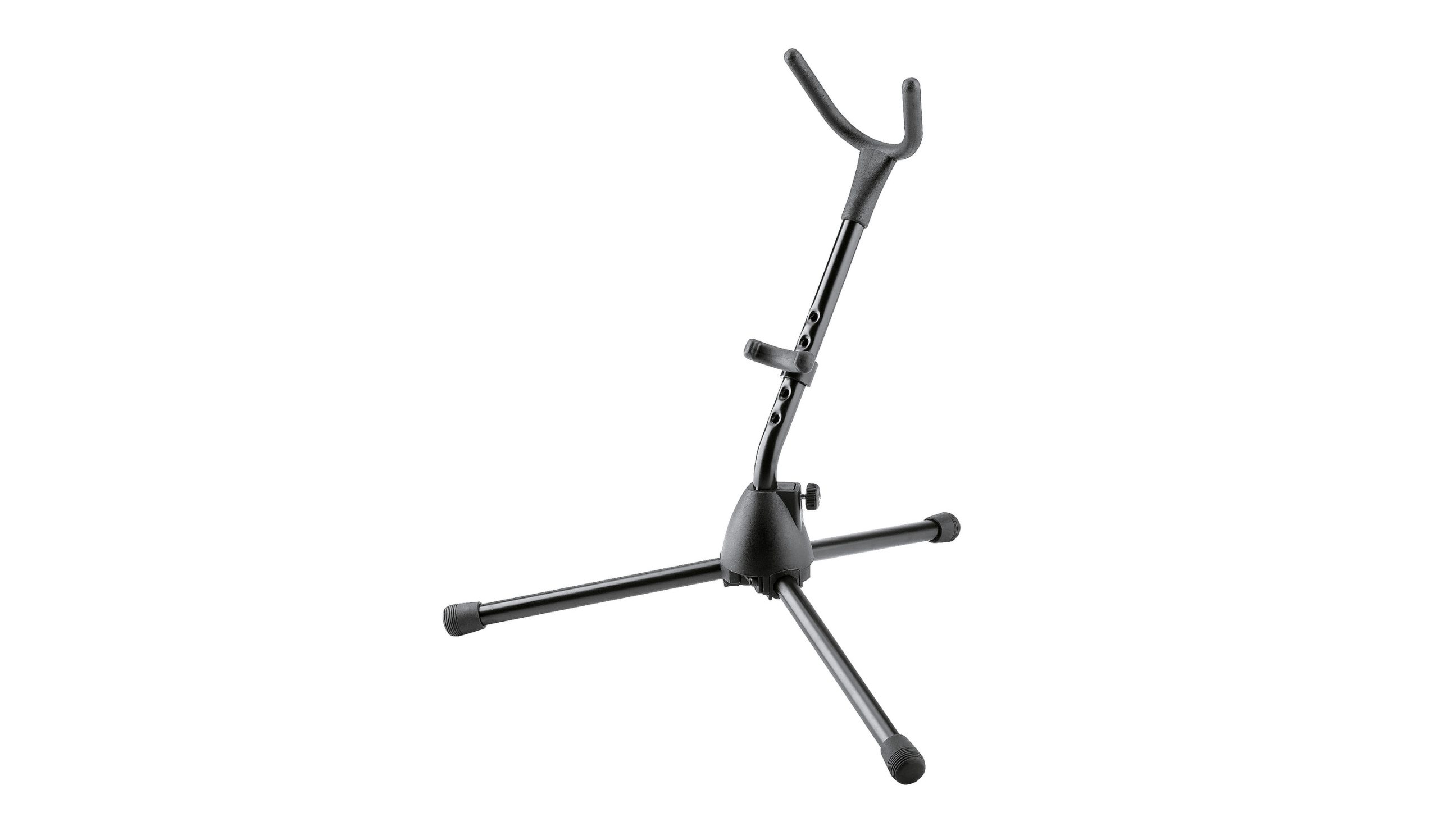 Adjustable folding stand for Eb Alto and Bb Tenor Sax. Fiberglass reinforced plastic base. Flexible upper support arm for different bell sizes. Lower support arm bracket with several vertical locking positions. All instrument support parts covered with exclusive non-marring plastic coating. To be used with peg holder 14301 and clarinet peg or with peg holder, adapter 15281 and pegs for trumpet, soprano sax or flugelhorn.