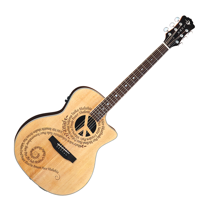 A laser-cut peace sign at the sound hole is surrounded by the word peace in different languages forming a graceful continuum across the soundboard. The Oracle Peace is Luna’s offering to remember all who have dedicated their lives to peace and to help imagine peace through music. This guitar delivers a sound that’s as rich and freeing as the concept that inspired the design. Luna’s signature crescent moon logo, inlaid in mother-of-pearl, shines brightly from the gently curved rosewood headstock. Elegant and durable brushed nickel tuners provide smooth, precise adjustment. Luna’s specially designed neck profile insures a comfortable playing experience that puts challenging notes and chords within easy reach.