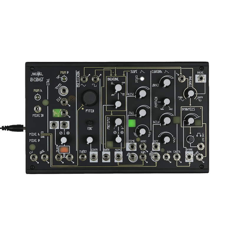 While the 0-COAST utilizes classic modular synthesis techniques, we designed it to operate with or without the use of patch cables. The necessary connections have been made from circuit to circuit so it operates as an expressive, musical MonoSynth. Using only the MIDI controller of your choice you could apply new timbres to your existing musical forms!