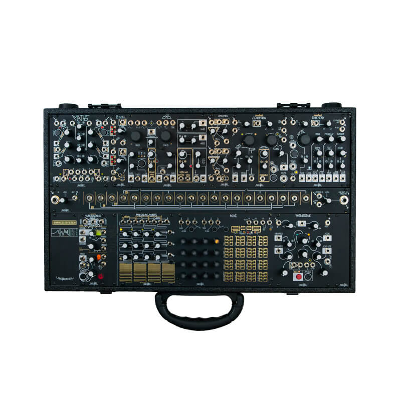The Shared System re-made in Black and Gold w/ the Erbe-Verb and CV Bus added. The personal favorite system of Make Noise founder Tony Rolando, this collection of modules is utilized by all artists for the Make Noise Records Shared System Series. It was also utilized by both Alessandro Cortini and Richard Devine for their performances at the 2012 Make Noise Opening party. The Shared System is the deepest and most complex of our systems bringing together all of our synthesis techniques into one system. From analog FM to voltage controlled granularization, the Shared System will go to more sound destinations than most folks have time to travel to in a single lifetime.