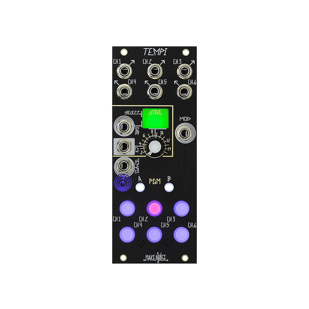 The TEMPI music synthesizer module is a 6 CHannel, polyphonic time-shifting clock module. It provides an intuitive method for creation and recall of complex clocking arrangements within a modular synthesizer system. Using HUMAN and/ or MACHINE programming you could re-create most classic Clock Divider and Multiplier arrangements and then continue on to create new ones. Store up to 64 for later recall and Select them using control signals from within your system or the Select Bus.