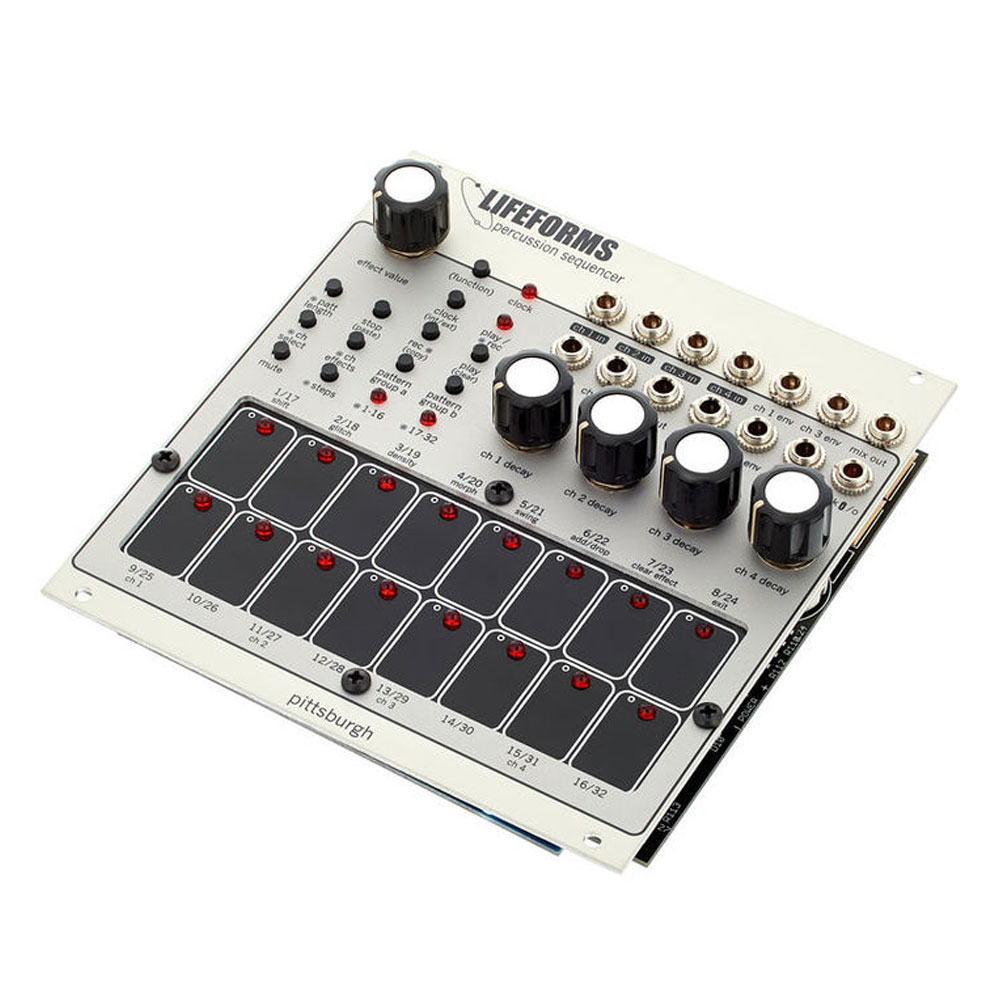 The Pittsburgh Modular Lifeforms Percussion Sequencer is a seriously featured, 4 channel eurorack beat programmer with a classic drum machine style interface. The familiar interface allows for quick mastery of all the features leaving the focus on the music. Seamlessly move around the module tweaking patterns and effects without ever stopping the beat. Easily create new patterns using the live performance or step recording modes, then add one of the powerful pattern effects to each channel to take the sequence to a new level. Designed to integrate into any size eurorack system, simply patch 4 audio signals through the integrated high quality VCAs to create a set of unique percussion voices. Eurorack drum programming has come to life.
