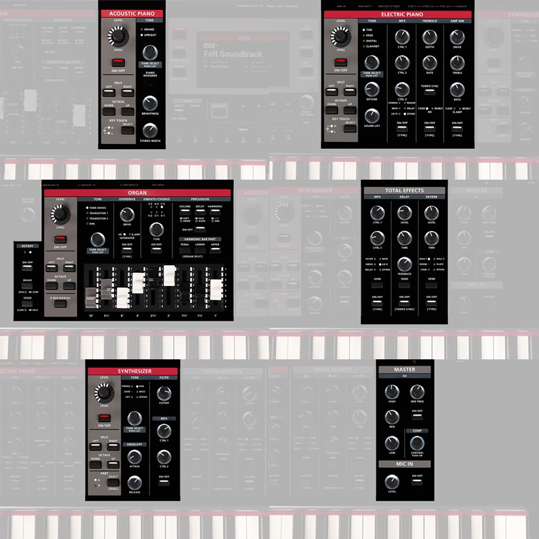 Newly developed Electric Piano engine with the latest SuperNATURAL advancements; includes Tine, Reed, Digital, and Clavinet types with customizable sound parameters, adjustable key touch, and dedicated EP effects