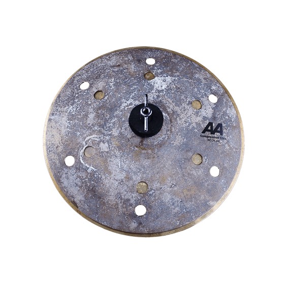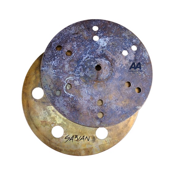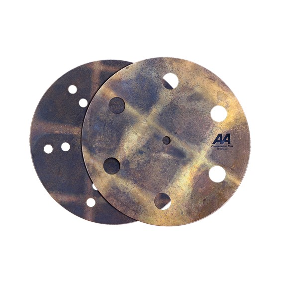 As with the Compression Hats, the top and bottom of this pairing feature hole patterns to enhance the sound. The bottom cymbal is thin, un-lathed and flat, with 6 one-inch holes. The top is slightly smaller than the bottom, has 6 rows of Aero holes and is medium thin. The smaller top creates a tight fit, and the holes project a quick attack, emulating an electronic “clap”. Overall, they are darker and lower-pitched than many of the stacking combinations popular today. A special process gives them their unique finish.