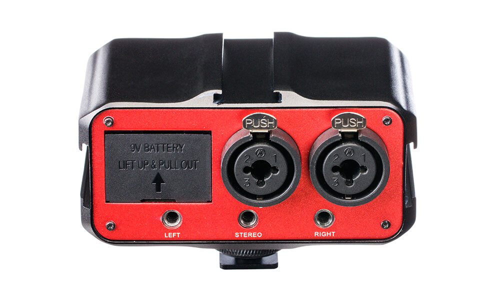 It attaches to the base of a camera, and a threaded socket on its base allows for mounting on a tripod or case. The SR-PAX1 features dual balanced XLR inputs, dual 3.5mm (TRS) inputs, and dual 6.3mm inputs which provide the ability to accepts signals from a wide variety of mic or line level sources such as wireless microphones and external audio recorders.