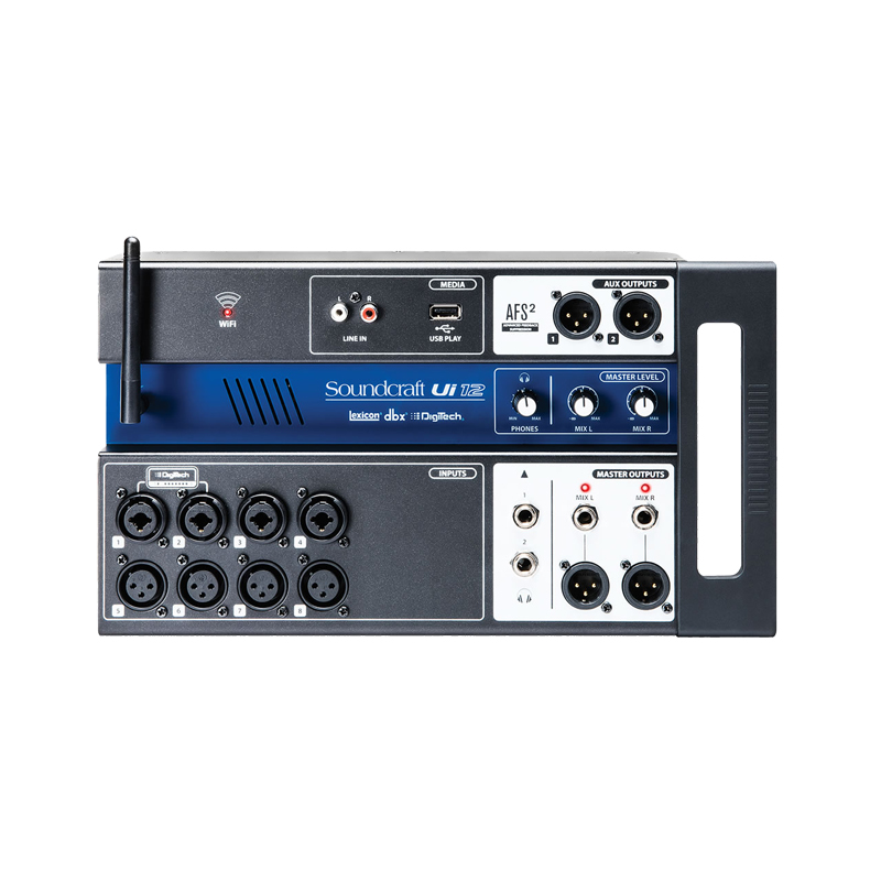 The Ui12 also features four XLR combo mic/line inputs, four XLR mic inputs, two channels of Hi- Z/instrument inputs, as well as a stereo RCA line input. A 2-channel USB media player is included, along with two balanced XLR Aux outputs, two quarter-inch headphone outputs with level control, plus balanced stereo XLR and quarter-inch main outputs. Two-channel USB audio playback is compatible with MP3, WAV and AIFF formats.