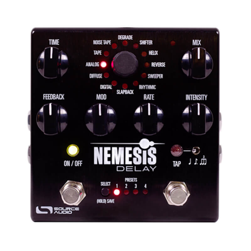 • Digital — A classic clear digital delay with optional delay time modulation. The intensity knob controls filtering allowing for high pass filters (creating a thinner delay sound) or low pass filters (creating a warmer delay sound). 12 o’clock on the Intensity knob offers a 100% pure, unfiltered delay. The Nemesis features a 56-bit signal path with a 24-bit delay line for immaculately clean repeats.