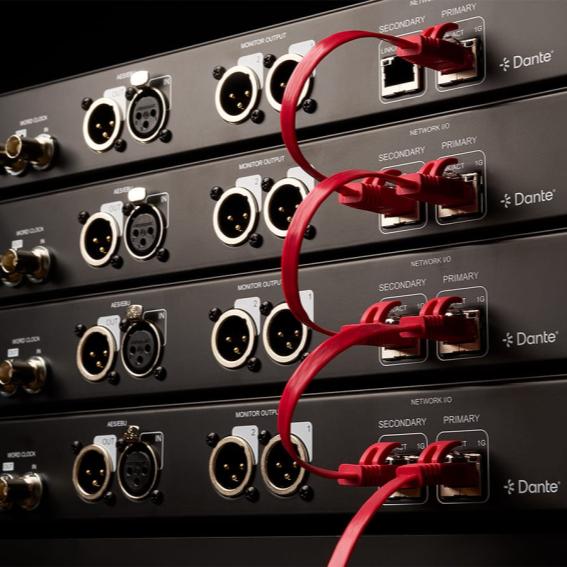 Link up to four x16Ds for a 64-channel Dante system with network redundancy
