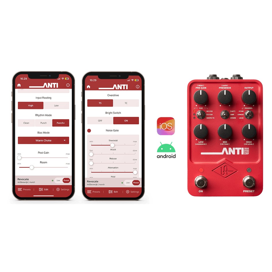 With the UAFX mobile app, you can pull up presets designed by pro guitarists or sculpt and save your own sounds to recall at any time. Plus the app unlocks deep customization for your pedal, allowing you to tweak hidden controls, boosts and noise gate settings, and even adjust output tube biasing